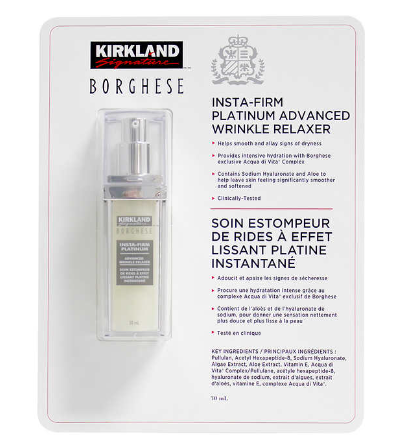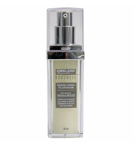 Kirkland Signature Insta-Firm Platinum advanced wrinkle relaxer is a fast absorbing serum that delivers sumptuous high impact hydration. This advanced formula contains powerful Acetyl Hexapeptide-8, Sodium Hyaluronate, Aqua di Vita® complex and Pullulan which infuse skin with essential moisture to stop signs of dryness and help smooth away the appearance of fine lines.